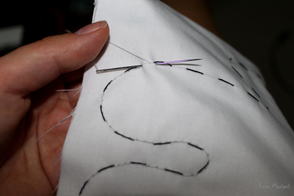 Мне сшивать детали, сколотые булавками, неудобно – постоянно колюсь. Поэтому я сперва сметываю детали контрастной нитью и вынимаю булавки. После того, как сошью детали вместе, контрастную нить вынимаю.