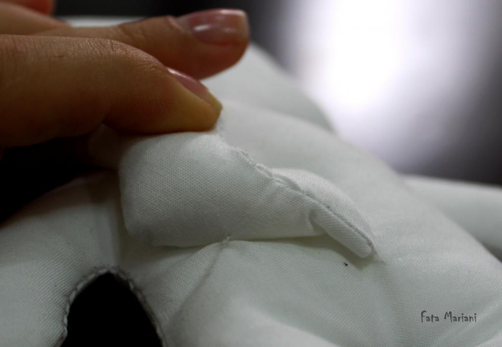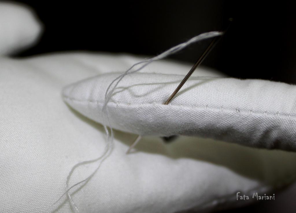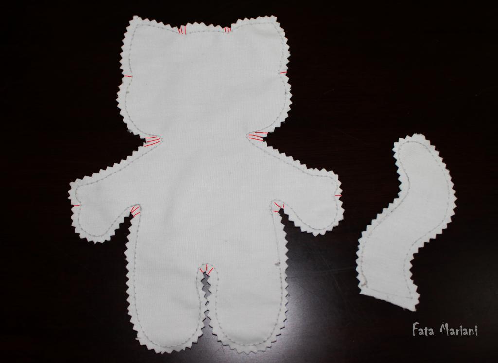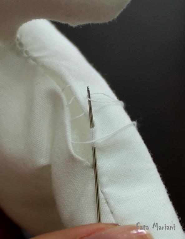 Также не забывайте узелки прятать внутри хвостика: в начале работы уколите иголкой в шов на стыке тканей и выведите наружу в нужном для сшива месте, затем потяните нитку, чтобы конец с узелком «спрятался» внутри хвостика.