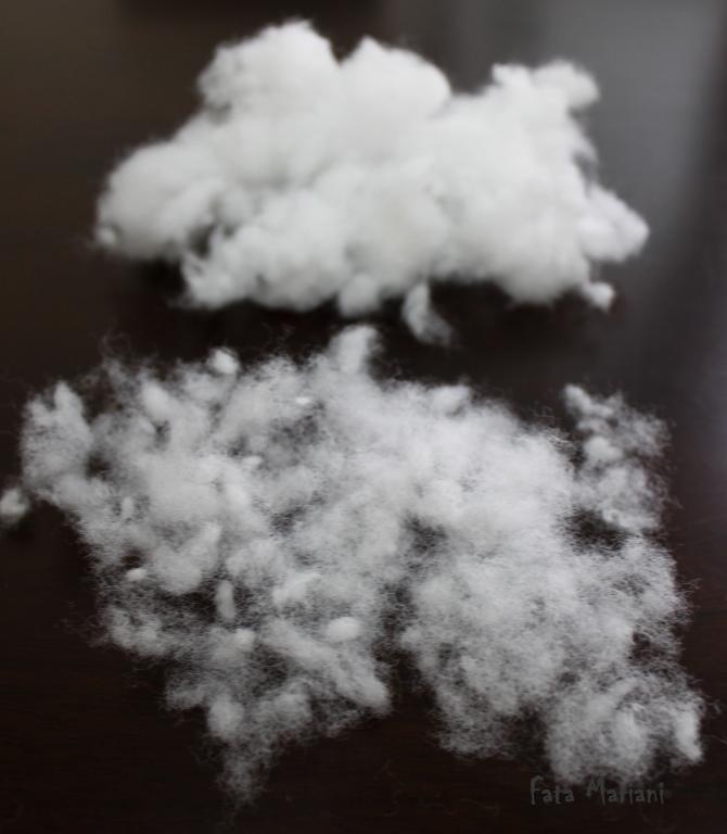 Перед набивкой наполнитель (холлофайбер, синтепух) распушите и порвите на мелкие кусочки. Это нужно для того, чтобы у вашей игрушки не было "целлюлита". На фото вверху сбитый наполнитель, внизу – распушенный.