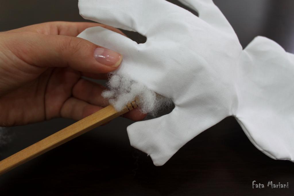Начинайте набивать игрушку через незашитое отверстие. Помогайте себе незаточенным карандашом или китайской палочкой.