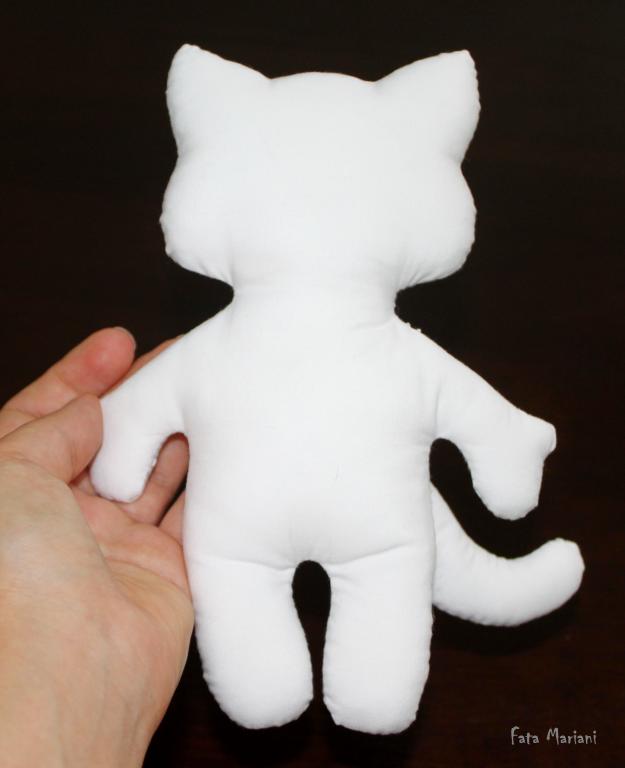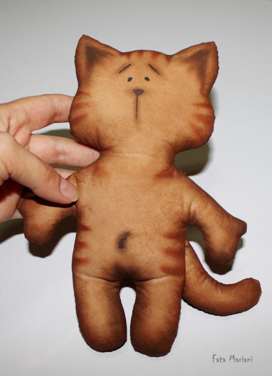 Осталось последнее - пришить хвостик. Расположение хвостика выбирайте на свое усмотрение: то ли он будет игриво торчать вверх, то ли будет грустно опущен. Проследите только, чтобы как минимум половина хвостика была видна из-за спины котика. Деталь пришивайте вдоль потайного шва на хвосте как всегда плотно, но не стягивая ткань. Пришивайте все тем же потайным швом.