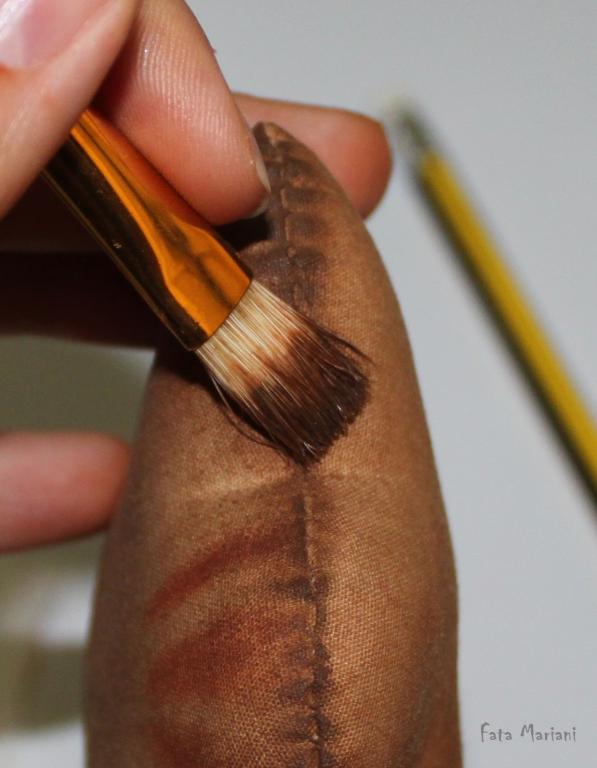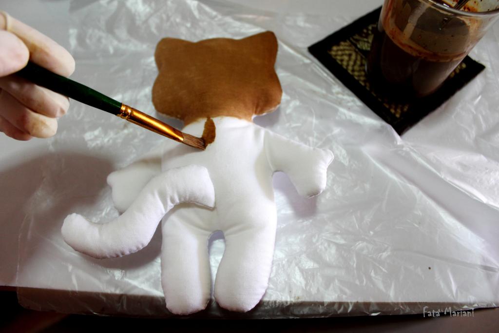Работайте жесткой кистью из щетины. Обмакните ее в раствор (не макайте до дна, иначе можете захватить кистью крупинки какао и ваша игрушка получится в крапинку), уберите излишки смеси о край посуды (чтобы смесь не капала с кисти) и начинайте красить. Сделайте несколько мазков либо на кусочке ткани, из которой вы шили котика, либо где-то на хвостике, чтобы проверить цвет. Если нужно, добавьте в смесь кофе или воду и откорректируйте тон.