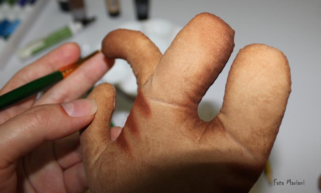 Я крашу сначала тыльную часть игрушки, затем лицевую и в конце хорошенько прокрашиваю швы, чтобы нигде не просвечивала неокрашенная ткань.