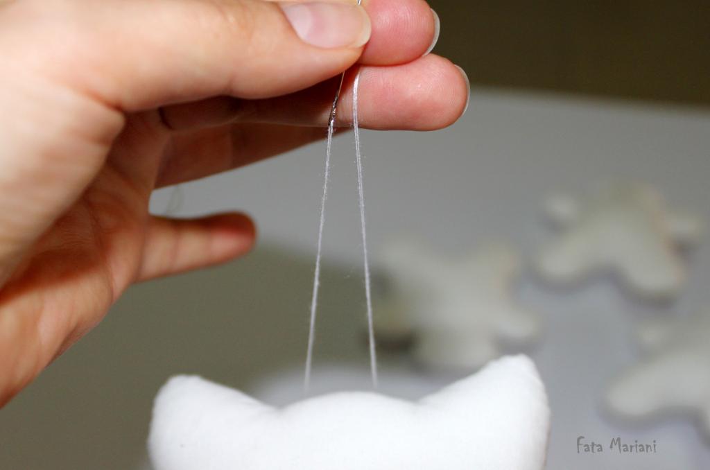 Если вы будете подвешивать игрушку, то перед покраской закрепите нить на макушке котика.