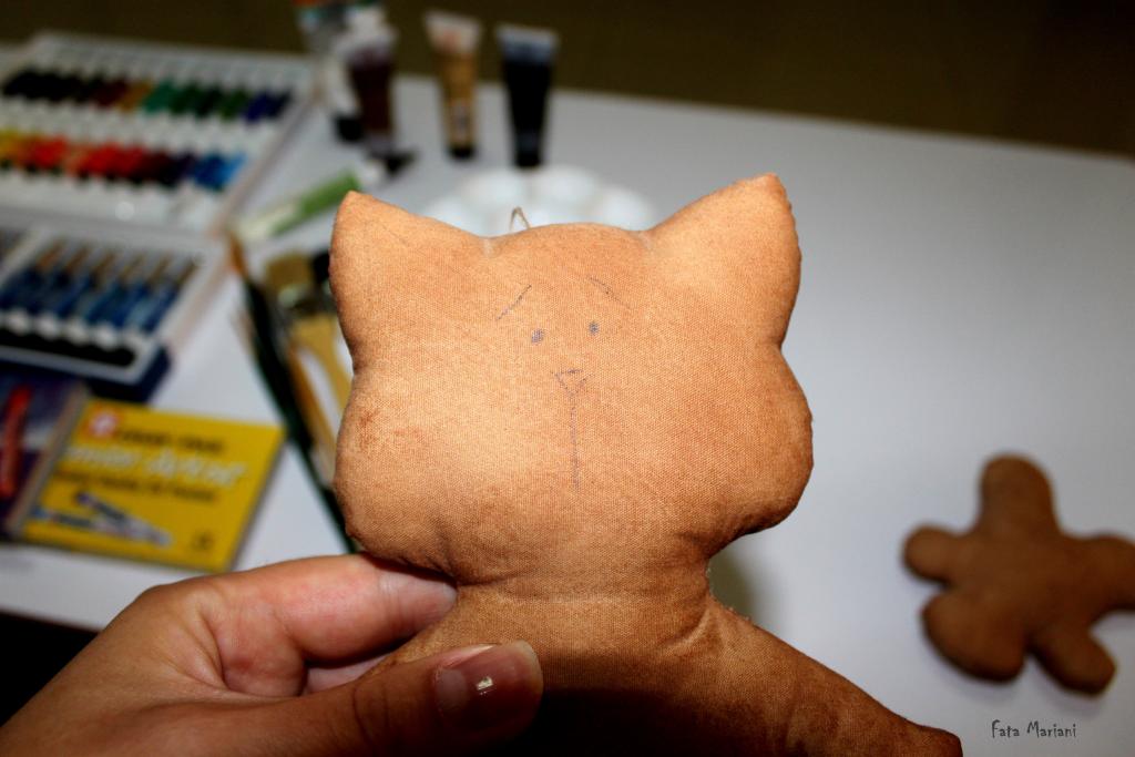 Работайте жесткой кистью из щетины. Обмакните ее в раствор (не макайте до дна, иначе можете захватить кистью крупинки какао и ваша игрушка получится в крапинку), уберите излишки смеси о край посуды (чтобы смесь не капала с кисти) и начинайте красить. Сделайте несколько мазков либо на кусочке ткани, из которой вы шили котика, либо где-то на хвостике, чтобы проверить цвет. Если нужно, добавьте в смесь кофе или воду и откорректируйте тон.